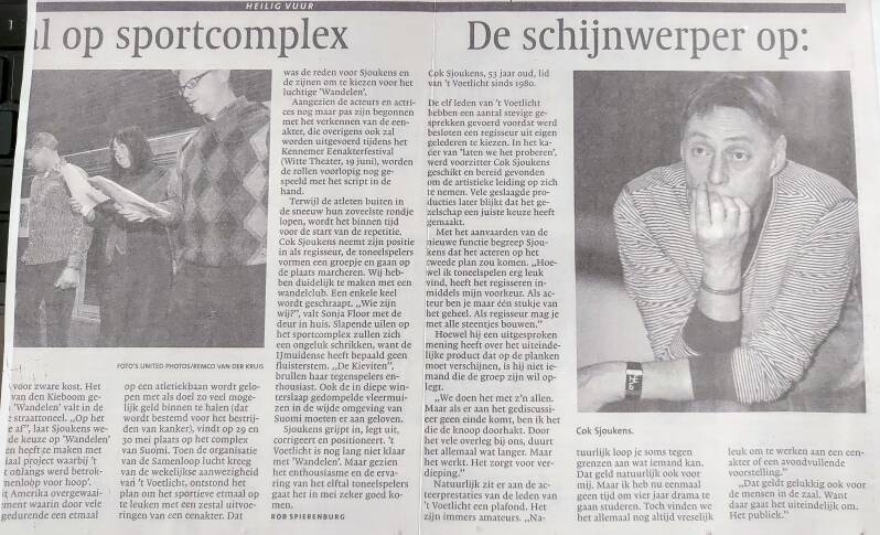 Ruim 10 jaar en nog veel meer kilo's geleden, ik ben dan nog steeds bij 't Voetlicht, repeteren we in Santpoort Noord te SUOMI. Er werd ons gevraagd door de organisatie van 'samenloop voor hoop' van het KWF om tijdens de 24 uur durende wandelestafette een aantal optredens te verzorgen om zodoende het moreel van de sporters hoog te houden. Een soort van straat-theater dus, in de openlucht, op een atletiekcomplex tussen de sporters en hun fans in. We speelden 6 maal dezelfde éénakter, genaamd 'wandelen', op diverse plekken op het complex en werden vaak overdonderd met gul applaus. Weer waren we een ervaring rijker geworden en wel met 'wandelclub; de kievitten'.
